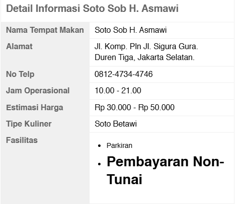 Setiap harinya Soto Sob H. Asmawi cabang Duren Tiga buka mulai pukul 10.00 pagi hingga pukul 21.00 malam. Pembayaran di sini bisa tunai dan non tunai.